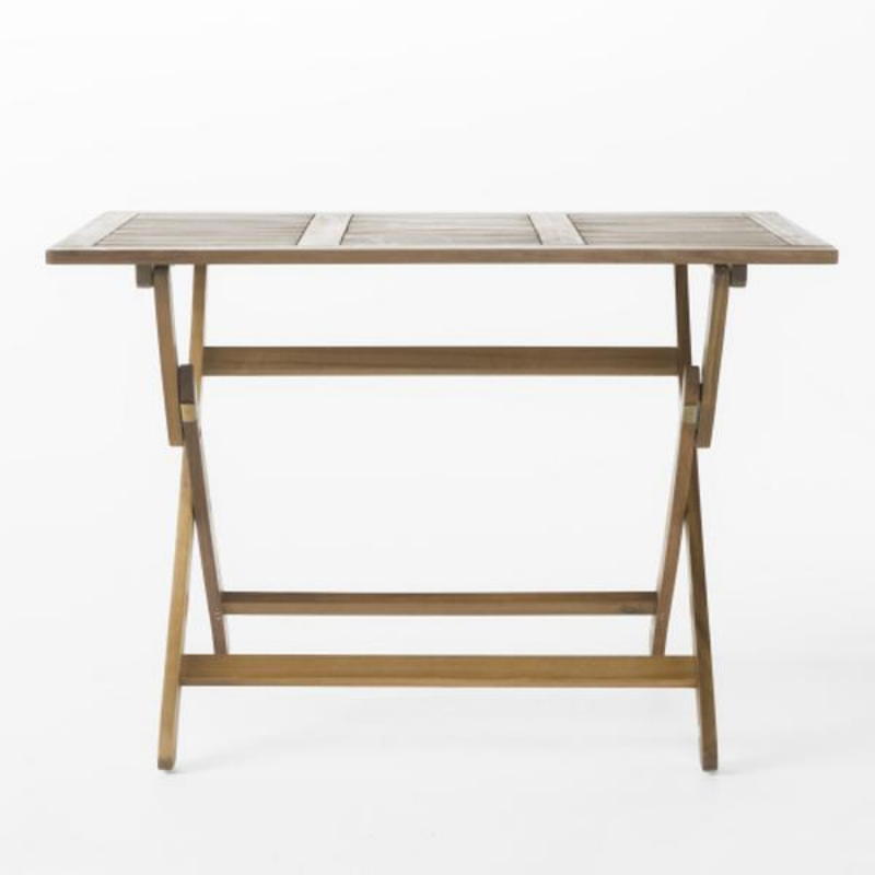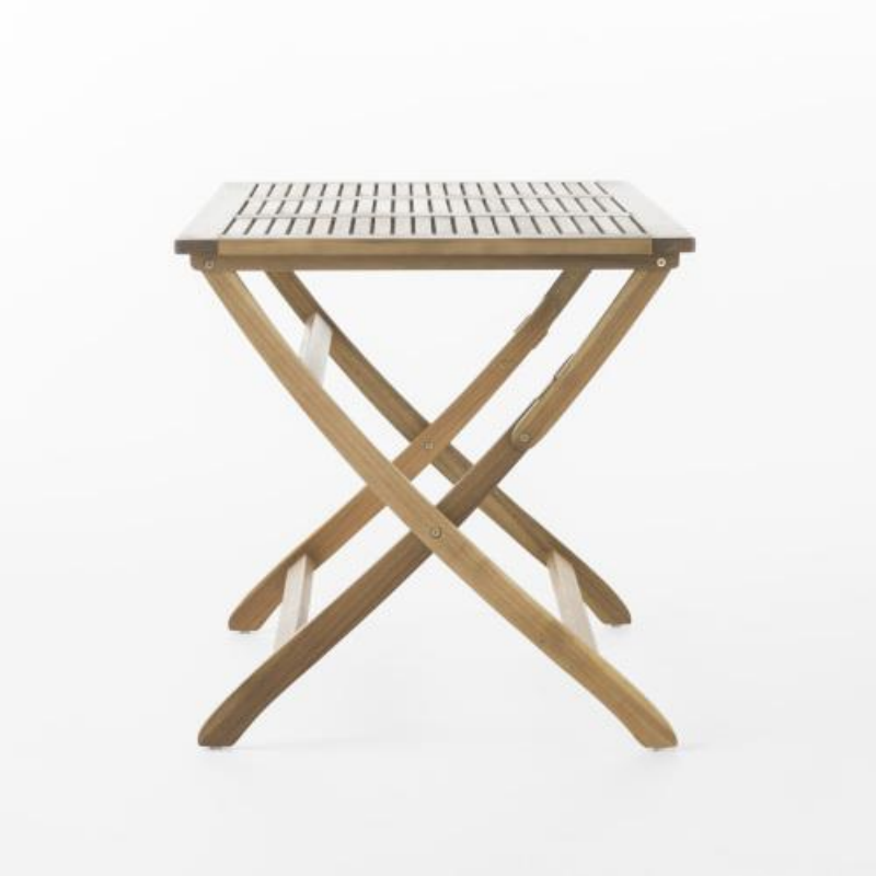 • Crafted from weather- and water-resistant acacia, it features an x-shaped base and a slatted top that prevents water from pooling after a storm